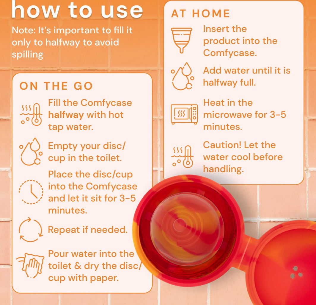 A bodyotics Comfycase mosó- és tárolóedénye mindenféle méretű és formájú menstruációs korong és kehely számára alkalmas. Az élelmiszerbiztonsági szempontból biztonságos szilikonból készült Comfycase lehetővé teszi a menstruációs termékek biztonságos és egyszerű mosását, sterilizálását és tárolását.