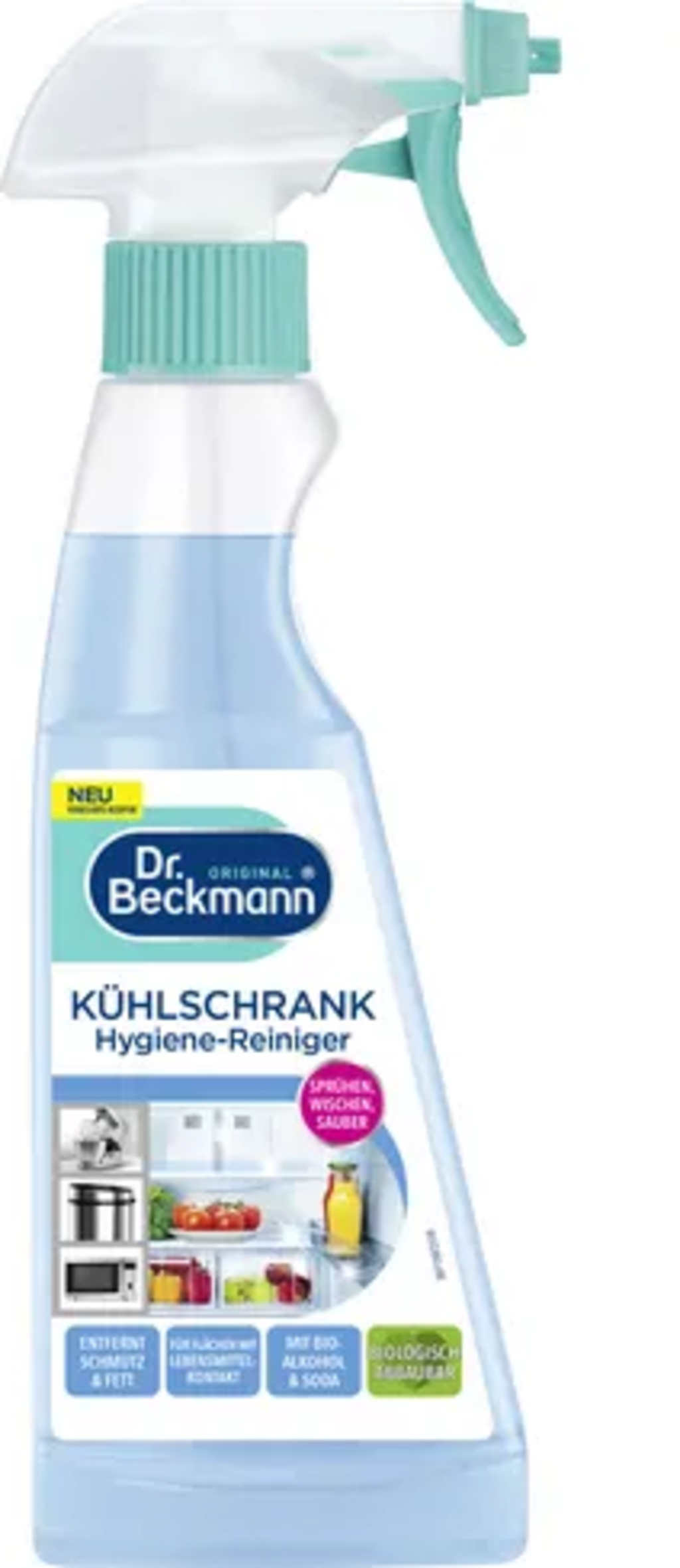 A **Dr. Beckmann** hűtőszekrény-tisztító bio-alkoholt és szódabikarbónát tartalmaz, így pillanatok alatt eltávolítja a zsírt, a szennyeződéseket, a természetes NEOFRESH® technológiának köszönhetően pedig a kellemetlen szagokat is!
