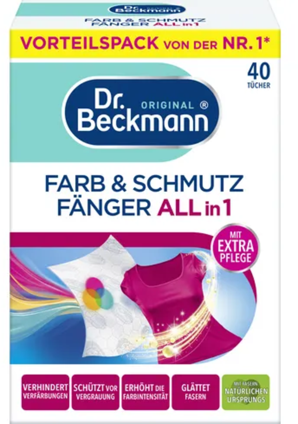 A Dr. Beckmann Szín- és koszfogó kendő All-in-1 alkalmas mintás és csíkos, többszínű ruhadarabokhoz, vagy fehér ruhákkal vegyes mosáshoz!