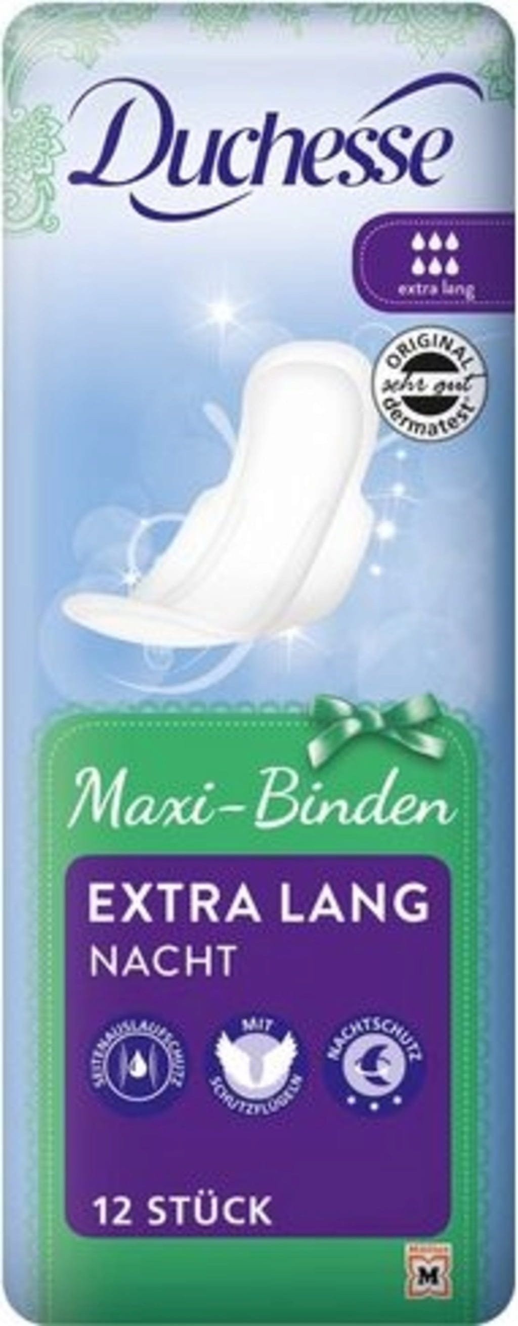 Az éjszaka folyamán is fontos a szivárgás elleni megbízható védelem, a maximális kényelemről való lemondás nélkül – a Duchesse Maxi extra hosszú éjszakai betét az oldalsó szivárgás elleni védelemnek köszönhetően közvetlenül a betét belsejébe vezeti a folyadékot, így abszolút biztonságot nyújt. A beépített fehérnevédő fólia, valamint a védőszárnyak plusz védelmet nyújtanak a ruházat szennyeződése ellen. A bársonyosan puha felület teszi teljessé a kényelmes védelmet.