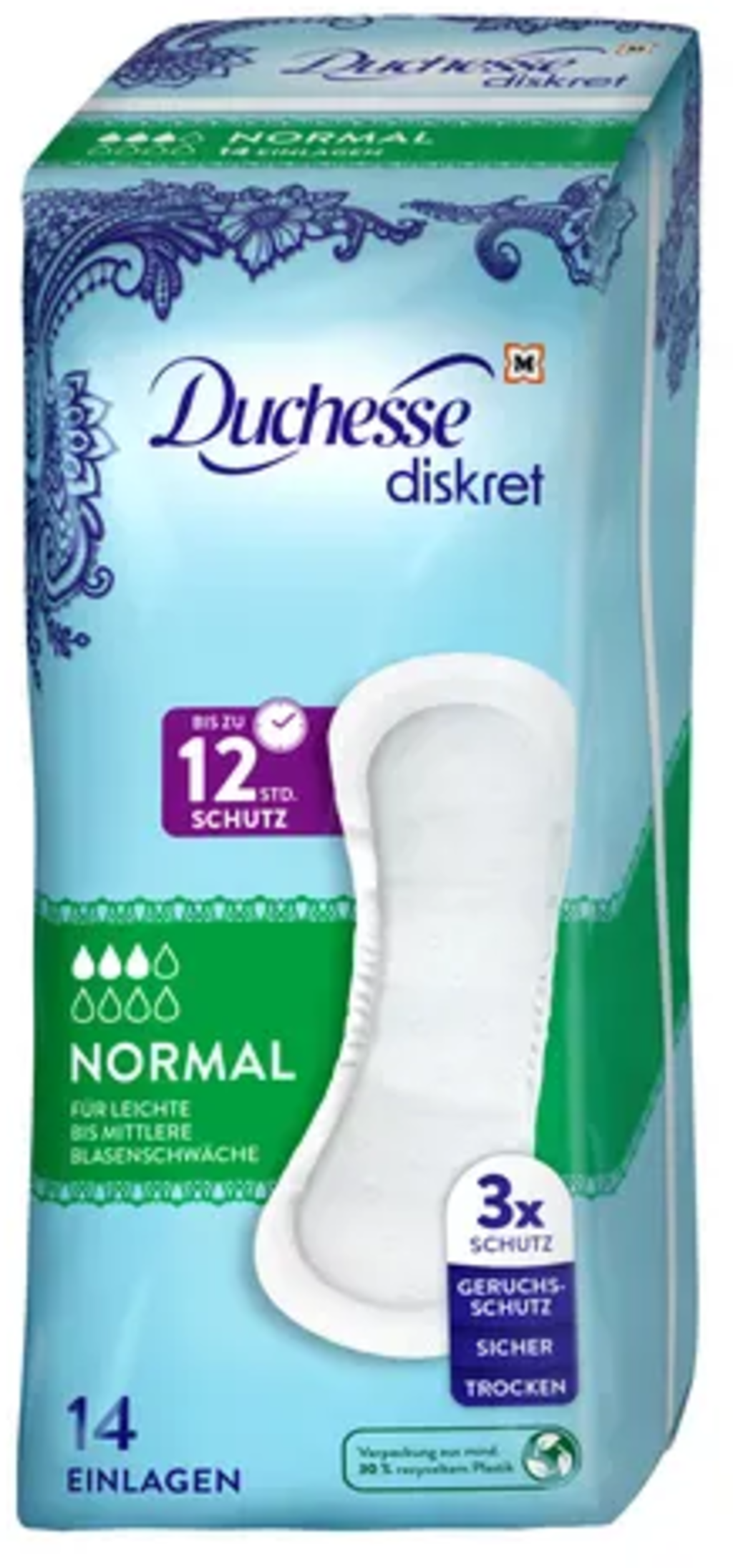 A Duchesse Normál higiéniai betét segít Önnek, hogy enyhe vagy középsúlyos vizelettartási problémák esetén is frissnek és biztonságban érezhesse magát. A betétek mindössze 7 mm vastagok, puha, selymes felületük pedig különleges viselési kényelmet biztosít. A rendkívül jó nedvszívó képességű mag megbízhatóan vezeti a folyadékot a betét belsejébe, így a nedvesség és a kellemetlen szagok biztonságosan elzárva maradnak.