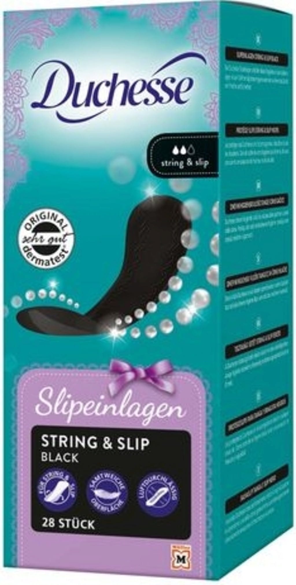 A Duchesse String és Slip Black tisztasági betétek megbízható védelmet nyújtanak a szivárgás ellen. A betétek nagy teljesítményű magja gyorsan felszívja a folyadékot, miközben légáteresztőek és lélegzőek maradnak. Rugalmasan használható sötét alsóneműkhöz vagy tangákhoz. A puha felület tökéletes viselési kényelmet biztosít.