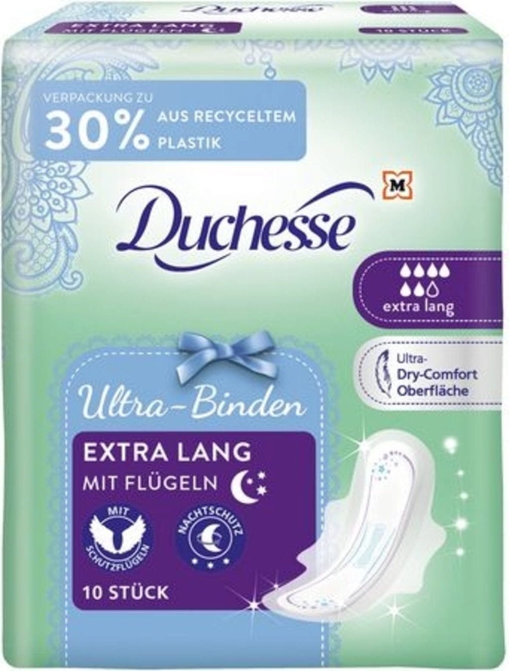 A Duchesse ultra szárnyas egészségügyi betét extra hosszú kivitelben megbízható védelmet nyújt erős menstruáció esetén, nappal és éjszaka egyaránt. A folyadék gyorsan elvezetésre kerül a felületről a betét belsejébe, ahol biztonságosan elzáródik. A biztonsági szárnyak megakadályozzák az oldalsó szivárgást. A bőr és a fehérnemű megbízhatóan száraz marad. A különleges kényelmi felület extra komfortérzetet biztosít.