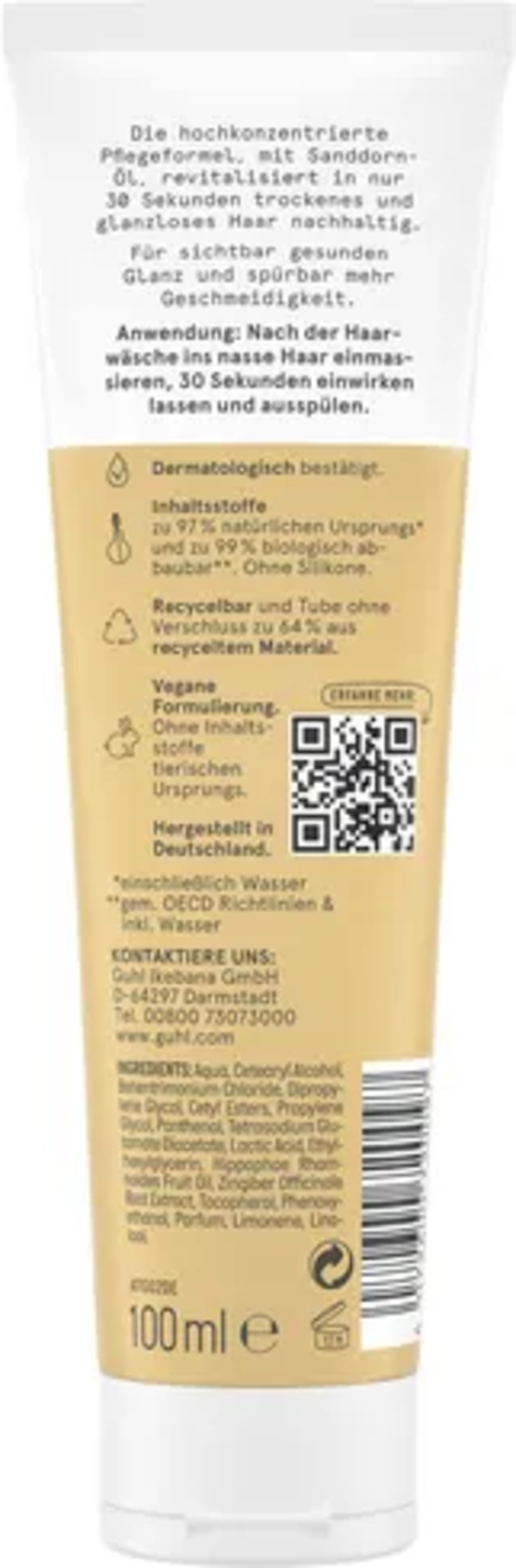 Aqua, Cetearylalcohol, Behentrimoniumchloride, Dipropylene Glycol, Cetyl Esters, Propylene Glycol, Panthenol, Tetrasodium Glutamate Diacetate, Lactic Acid, Ethylhexylglycerin, Hippophae Rhamnoides (Sea Buckthorn) Fruit Oil, Zingiber Officinale Root Extract, Tocopherol (Vitamin E), Phenoxyethanol, Parfum, Limonene, Linalool