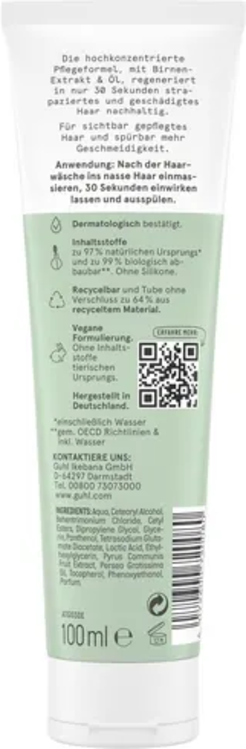 Aqua, Cetearylalcohol, Behentrimoniumchloride, Cetyl Esters, Dipropylene Glycol, Glycerin, Panthenol, Tetrasodium Glutamate Diacetate, Lactic Acid, Ethylhexylglycerin, Pyrus Communis Fruit Extract, Persea Gratissima (Avocado) Oil, Tocopherol (Vitamin E), Phenoxyethanol, Parfum