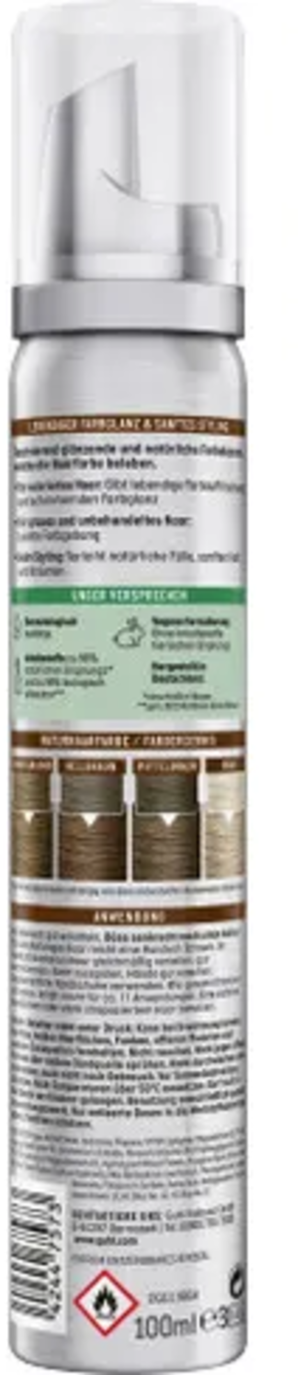 Aqua, Alcohol Denat, Isobutan, Propane, Vp/Va Copolymer, Polyquaternium-11, Peg-40 Hydrogenated Castor Oil, Cetrimoniumchlorid, Persea Gratissima (Avocado) Oil, Ethylhexylglycerin, Butan, Peg-9 Dimethicone, Polyquaternium-10, Hydrolized Wheat Protein, Propylene Glycol, Chamomilla Recutita (Matricaria) Flower Extract, Sodium Hydroxyde, Aloe Barbadensis Leaf, Phenoxyethanol, Sodium Benzoate, Potassium Sorbate, Sorbic Acid, Methylparaben, Parfum, Basic Brown 17, Hc Blue No. 12, Hc Blue No.17
