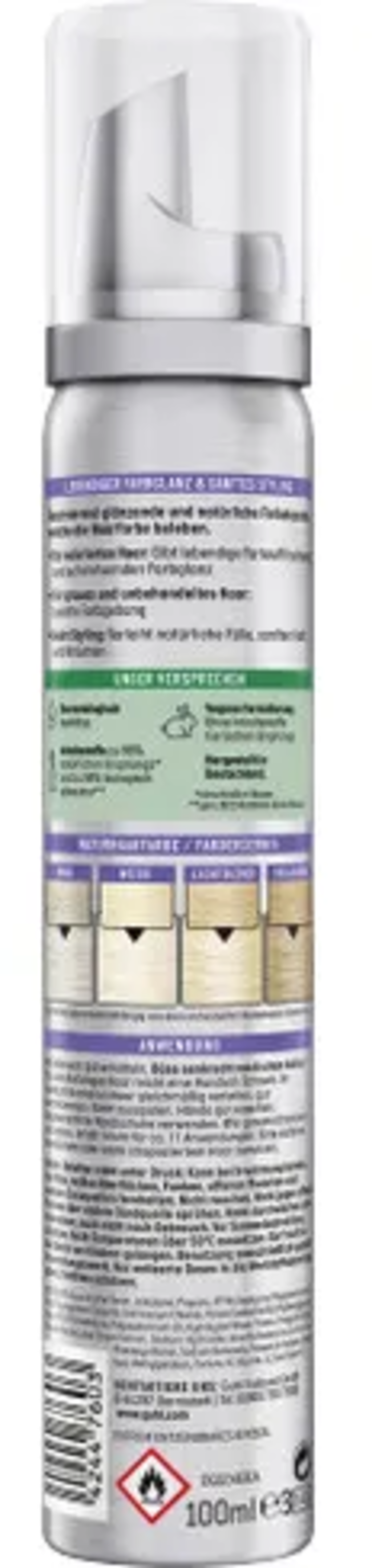 Aqua, Alcohol Denat, Isobutan, Propane, Vp/Va Copolymer, Polyquaternium-11, Peg-40 Hydrogenated Castor Oil, Cetrimoniumchlorid, Persea Gratissima (Avocado) Oil, Ethylhexylglycerin, Butan, Peg-9 Dimethicone, Polyquaternium-10, Hydrolized Wheat Protein, Propylene Glycol, Chamomilla Recutita (Matricaria) Flower Extract, Sodium Hydroxyde, Aloe Barbadensis Leaf, Phenoxyethanol, Sodium Benzoate, Potassium Sorbate, Sorbic Acid, Methylparaben, Parfum, Hc Blue No. 12, Acid Violet 43