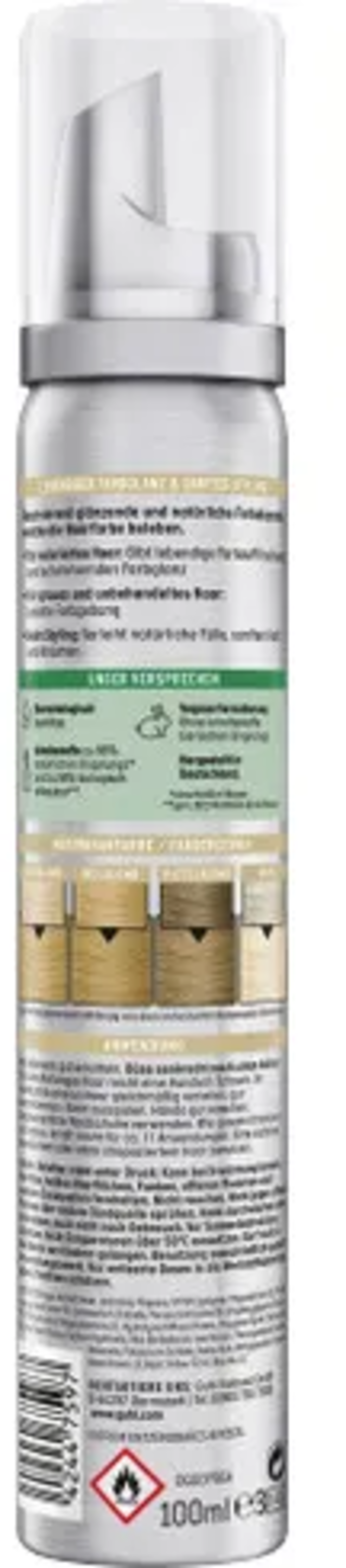 Aqua, Alcohol Denat, Isobutan, Propane, Vp/Va Copolymer, Polyquaternium-11, Peg-40 Hydrogenated Castor Oil, Cetrimoniumchlorid, Persea Gratissima (Avocado) Oil, Ethylhexylglycerin, Butan, Peg-9 Dimethicone, Polyquaternium-10, Hydrolized Wheat Protein, Propylene Glycol, Chamomilla Recutita (Matricaria) Flower Extract, Sodium Hydroxyde, Aloe Barbadensis Leaf, Phenoxyethanol, Sodium Benzoate, Potassium Sorbate, Sorbic Acid, Methylparaben, Parfum, Basic Brown 17, Basic Yellow 57, Disperse Violet 1, Hc Blue No. 12, Hc Blue No.17