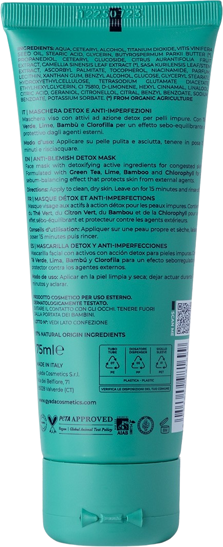 A GYADA Cosmetics Detox arcmaszk eltávolítja a szennyeződéseket és láthatóan javítja az arcszínt. Ideális tisztátalan és zsíros bőr esetén, amelyet a szmog külső hatásai is terhelnek. A zöld tea, a lime és a bambuszvíz fő összetevők pórusmély tisztítást biztosítanak, összehúzó és antioxidatív hatásúak. Ezenkívül formulája niacinamidot (B3-vitamint) tartalmaz, amely szabályozza a faggyútermelést, valamint klorofillt, mint természetes antioxidáns és szőlőmagolajat, amely védi a bőrt a szabad gyökökkel szemben.