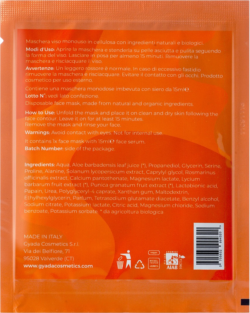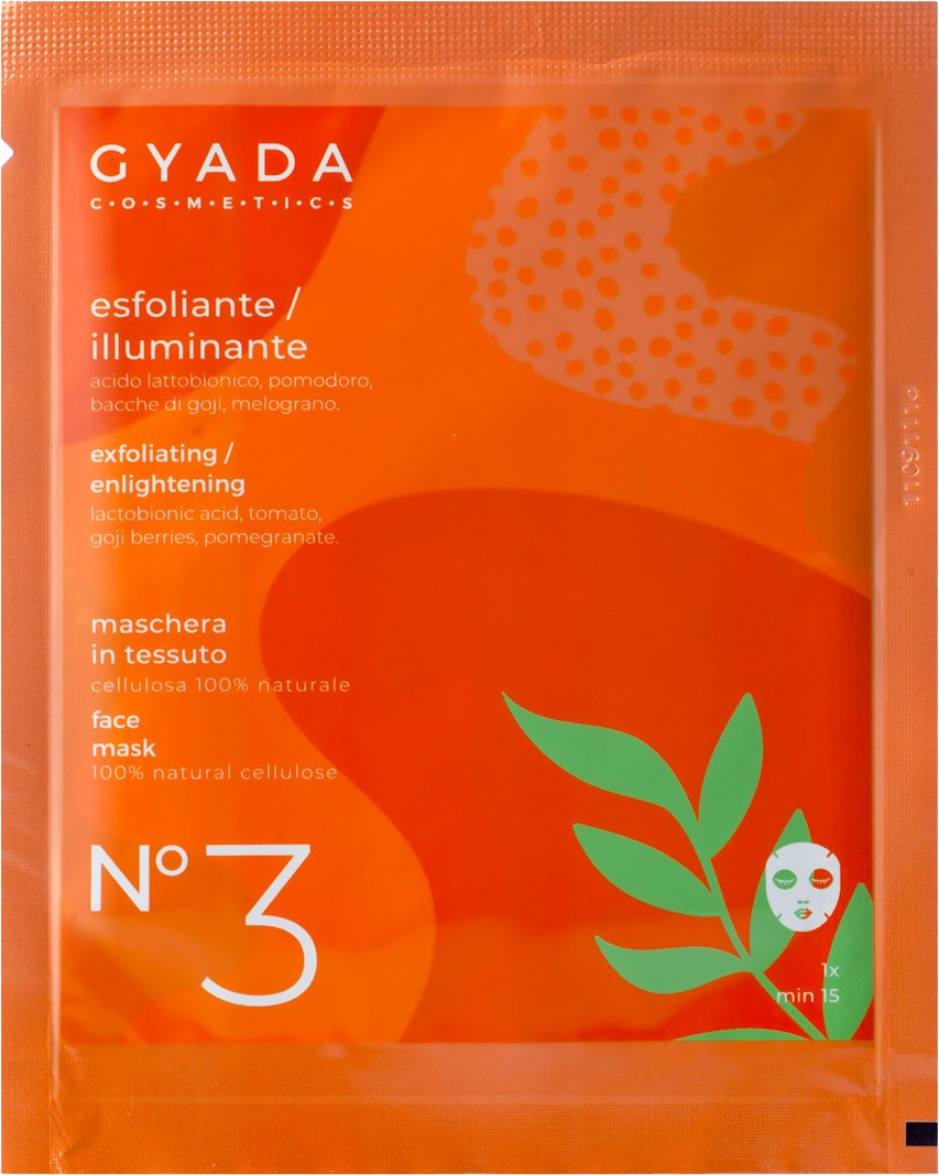 A GYADA Cosmetics ezzel az egyszer használatos kendőmaszkkal optimális heti ápolást biztosít. Eltávolítja az elhalt hámsejteket, a szennyeződéseket és a szmog maradványait. A laktobionsavat, paradicsomot, goji bogyót és gránátalmát tartalmazó növényi ápolókomplex tiszta és világos megjelenésű arcbőrt biztosít.