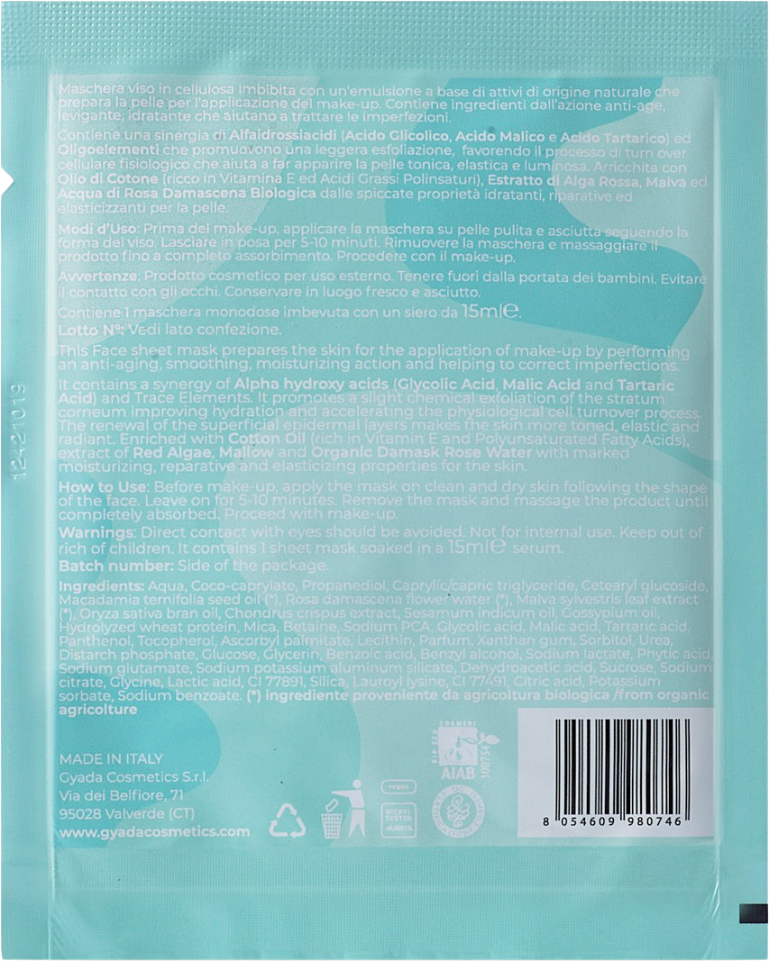 Ez a szövetmaszk egy négy az egyben ápoló: Primer, hidratálás, Anti-Aging és feszesítés. Az AHA (glikolsav, almasav és borkősav) és a nyomelemek szinergiája gyengéd peeling hatást biztosít, valamint javítja a hidratációt és támogatja a sejtek megújulását. A bőr legfelső rétegeinek regenerálása által a bőr erősebb, rugalmasabb és ragyogóbb lesz. A gyapotolajjal, vörös algával, mályvával és rózsavízzel gazdagított készítmény optimális hidratálást és új rugalmasságot biztosít.