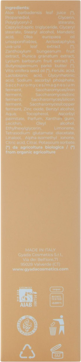 Aloe Barbadensis Leaf Juice[1], Propandiol, Glycerin, Polyglyceryl-2 Stearate, Caprylic/Capric Triglyceride, Glyceryl Stearate Se, Stearyl Alcohol, Mandelic Acid, Olea Europaea (Olive) Oil, Arctostaphylos Uva Ursi (Bearberry) Leaf Extract[1], Zanthoxylum Bungeanum Fruit Extract, Punica Granatum (Pomegranate) Extract, Lycium Barbarum (Goij) Fruit Extract[1], Butyrospermum Parkii (Shea) Butter[1], Vitis Vinifera Seed Oil[1], Ferulic Acid, Lactobionic Acid, Glycyrrhetinic Acid, Sodium Ascorbyl Phosphate (Vitamin C), Saccharomyces/Magnesium Ferment, Saccharomyces/ Iron Ferment, Saccharomyces/ Zinc Ferment, Saccharomyces/Silicon Ferment, Saccharomyces/ Copper Ferment, Zinc Oxide, Benzyl Alcohol, Aqua, Tocopherol (Vitamin E), Ascorbyl Palmitate (Vitamin C), Parfum, Xanthan Gum, Lecithin, Oleyl Alcohol, Ethylhexylglycerin, Limonene, Tetrasodium Glutamate Diacetate, Linalool, Alpha-Isomethyl Ionone, Citricacid, Citral, Potassium Sorbate