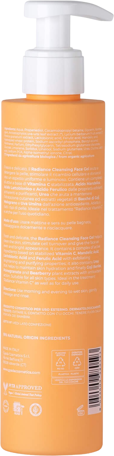 A Radiance tisztítógél frissítő hatású és gyengéd tisztítást biztosít, valamint serkenti a regenerációt és sima, ragyogó arcszínt biztosít. Stabilizált C-vitamint, mandulasavat, laktobionsavat és ferulsavat tartalmazó komplexe peeling, világosító és tisztító hatást biztosít.