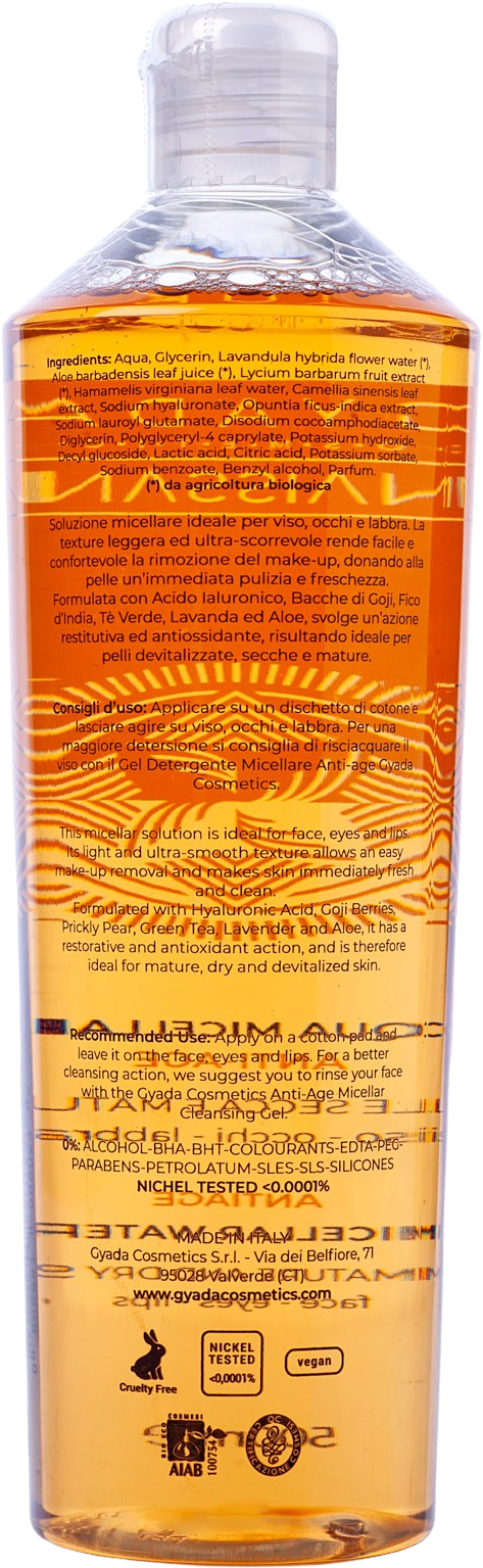 A terméket kifejezetten az érett, fáradt, matt és száraz bőrre fejlesztették ki. A micellás víz antioxidánsokban és regeneráló hatóanyagokban gazdag, például hialuronsav, goji bogyó, kaktuszfüge, zöld tea, aloe vera és levendula.