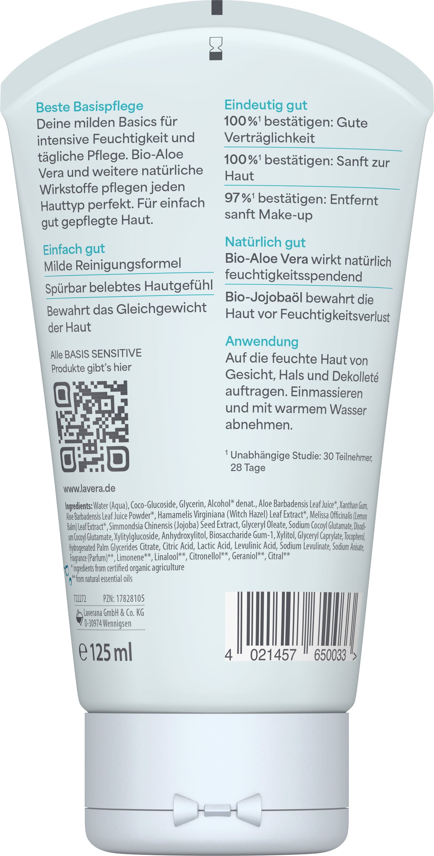 A lavera természetes tisztító gélje eltávolítja a szennyeződéseket, és egyáltalán nem tartalmaz illatanyagokat vagy színezékeket. A bio aloe vera és a bio jojobaolaj hidratálja a bőrt, valamint bársonyosan puha érzetet kölcsönöz neki.