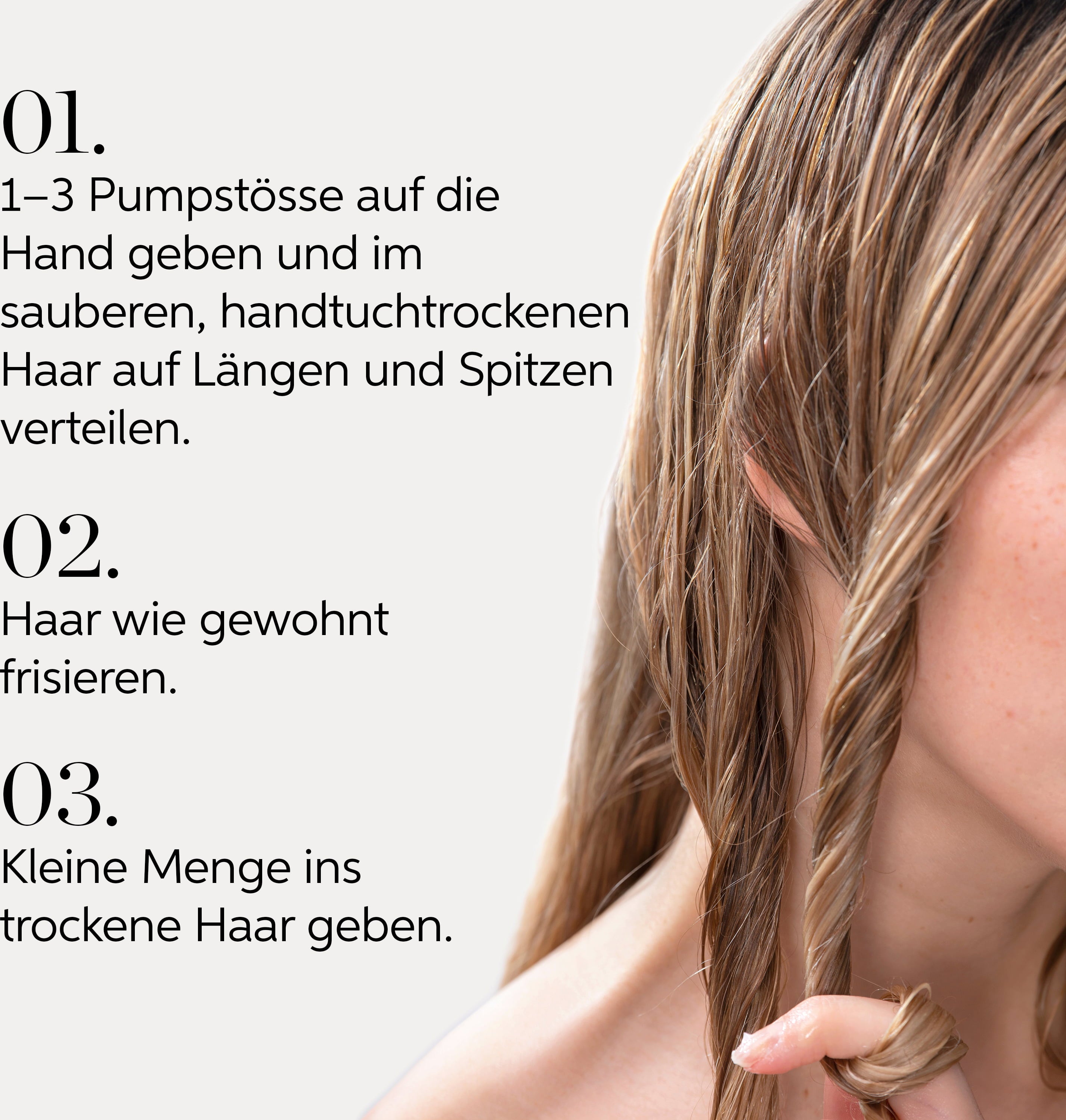 Használat előtt rázza fel. Tegyen 1-2 nyomásnyit tenyereibe, és egyenletesen oszlassa el a hajhosszon és végeken. Ne öblítse le.