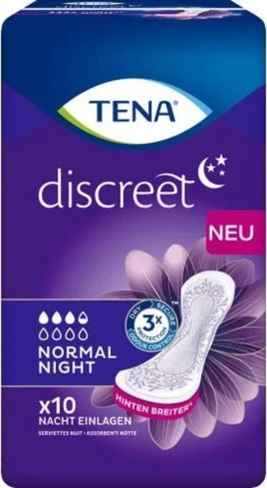 Ezen okokból kifolyólag a Tena kifejlesztett egy olyan betétet, amely éjszaka szárazon tartja Önt és biztonságérzetet nyújt. A nagyméretű betét hátul 25%-kal hosszabb és 15%-kal szélesebb, hogy az oldalt és háton alvók számára is optimális védelmet biztosítson. A betét emellett a nedvszívó magnak köszönhetően a túlzott nedvesség okozta kellemetlen bőrproblémáktól is véd. A Fresh Odor Control segítségével pedig a szagokat is semlegesíti és magába zárja.