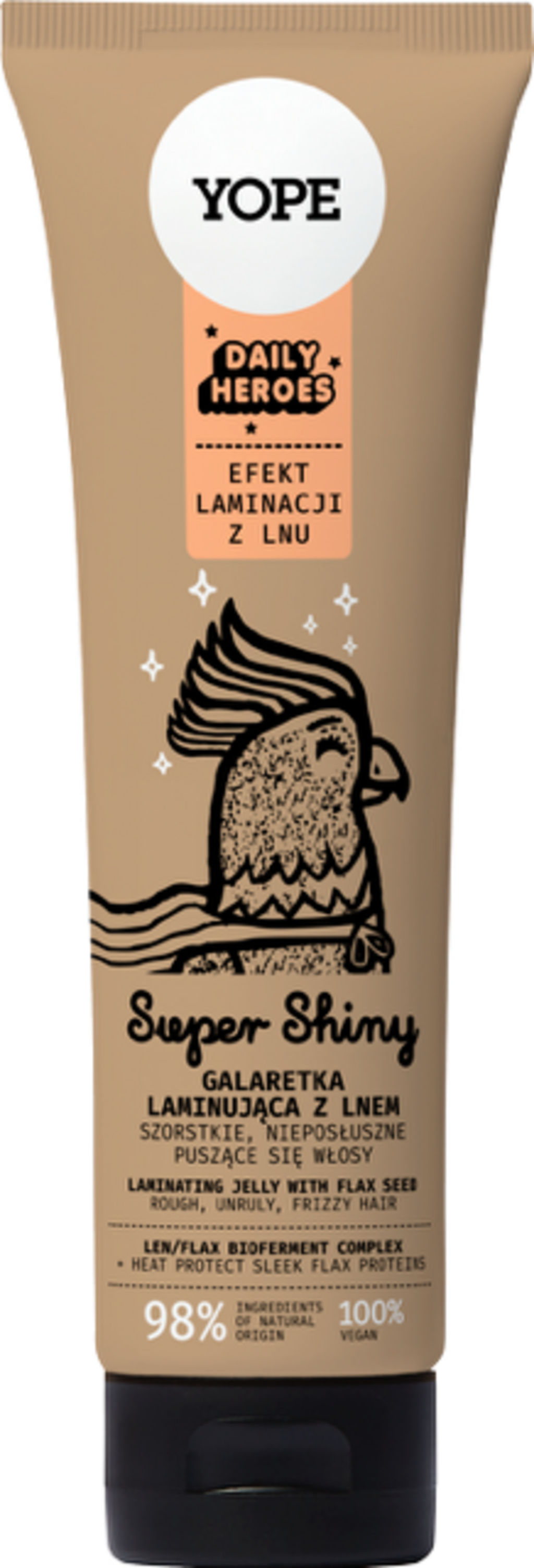 A YOPE Daily Heroes Super Shiny Laminating Jelly egy lamináló zselé göndör, rakoncátlan és durva hajra. A zselé simítja a hajat, hidratálja, és véd a göndörödés és a töredezés ellen. A természetes hővédelem a formázást is megkönnyíti. Értékes lenmagkivonattal dúsítva.